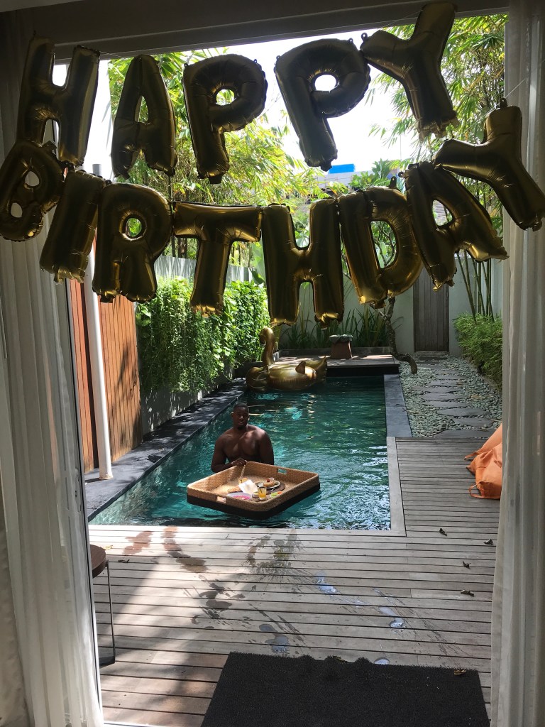 I had bought along with me the do-it-yourself happy birthday signs that you blow up with a straw and just attach to string. You can buy these for around £7 from card stores like Scribbles or Paperchase and it was all flat packed so I could put it in my bag easily. Once all blown up, the breakfast came and I had ordered a floating tray for the pool. It was great for him to wake up too (I’d love to wake up to that any day).