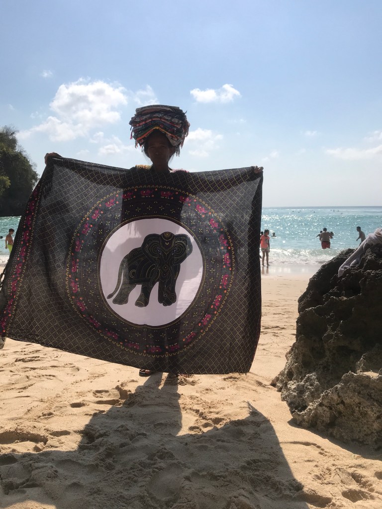 After enjoying the waves, you can sit on sand and enjoy the scenery. Local boys surf out and climb the rocks to jump off which looks super cool and you can also watch the pros surf the waves. You can also find local women selling traditional printed cloths and robes which you can buy for 10,000 rupiah.