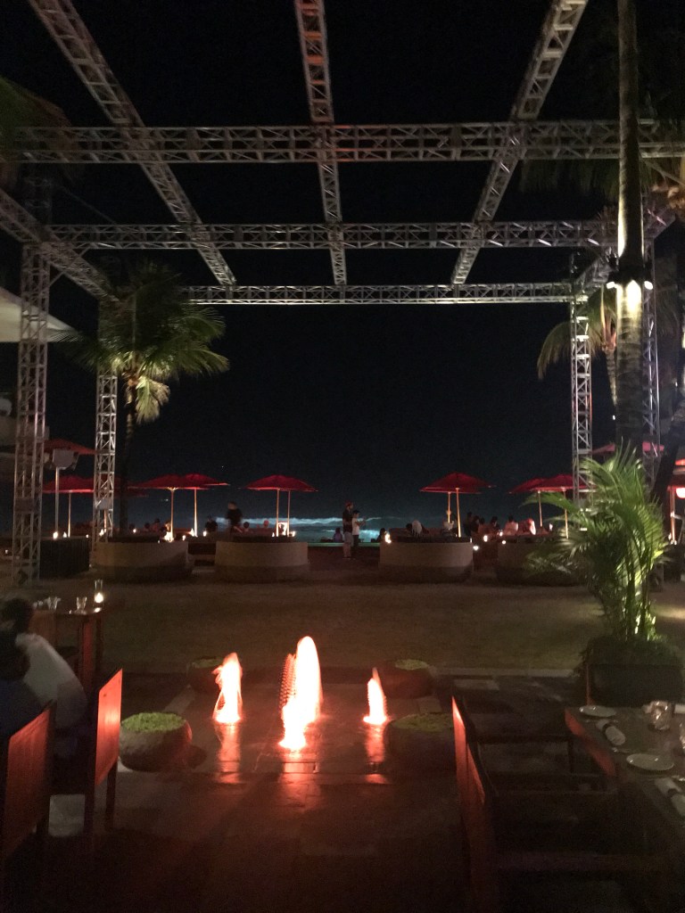 After getting comfortable and enjoying the ambiance we started to realise that the waves were getting higher and a lot closer to where we were sitting. Due to the earthquake in Lombok, the waves around the islands were quite dangerous and this night they were definitely out to get us HAHA. They came so close that people in front of us were left soaking wet after not being able to lift them self quick enough from their beanbag. (Which I can imagine might have been me) HAHA. So we moved ourselves into the restaurant overlooking the umbrella so that we were safe.
