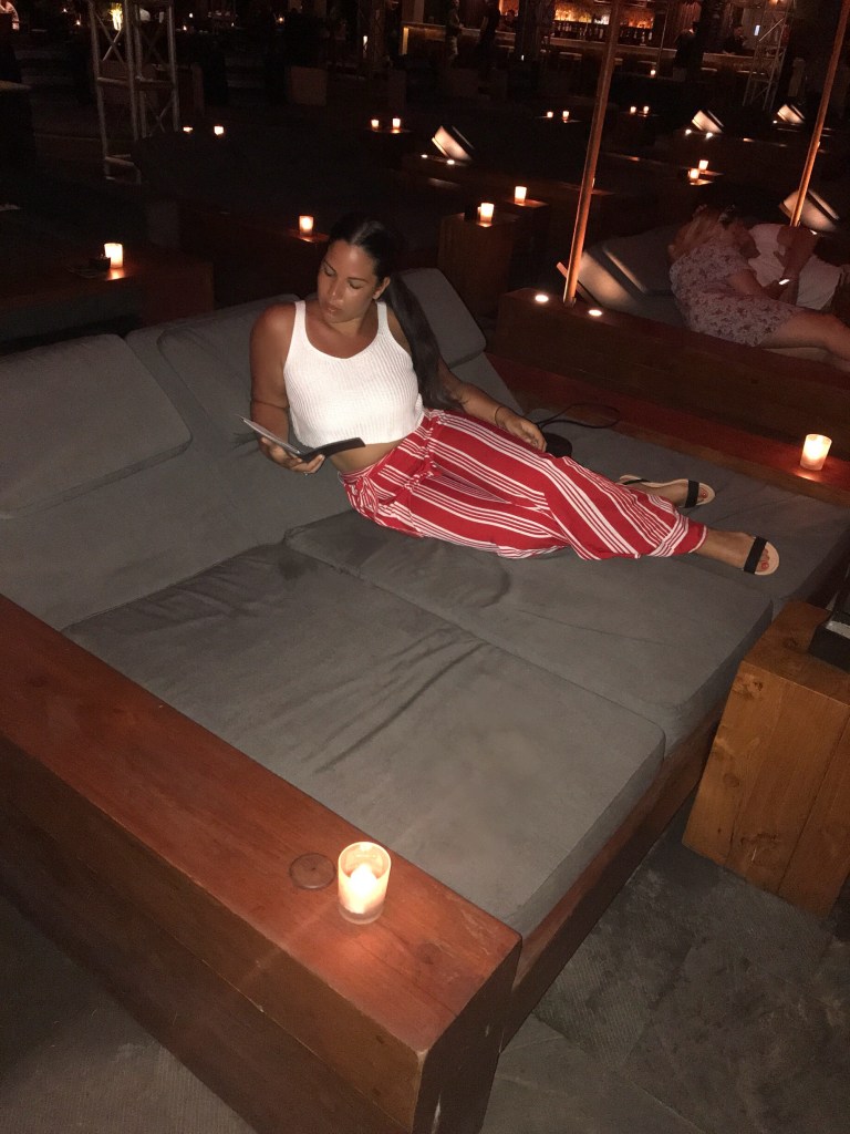 We found a day bed where they charge a minimum spend of 600.000 rupiah which is around £30 and that was easily spent after cocktails and food, so we could chill comfortably together and enjoy the music and ambiance.