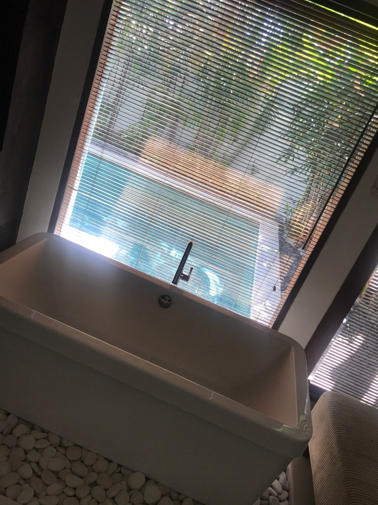 The bathroom was just as big with a whole bathtub with a view of the pool, his and hers sinks which was perfect and a huge walk in shower. The villa was cool and spacious and we felt right at home